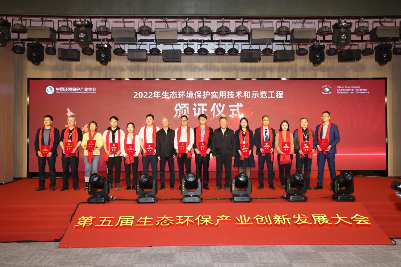 会议同时举办了2022年生态环境保护实用技术和示范工程颁奖典礼,我司2项技术装备入选并上台领奖。医院污水安全稳定智能消毒设备入选重点生态环境保护实用技术,成都市第二人民医院污水处理站提标改造项目入选生态环境保护技术示范工程。