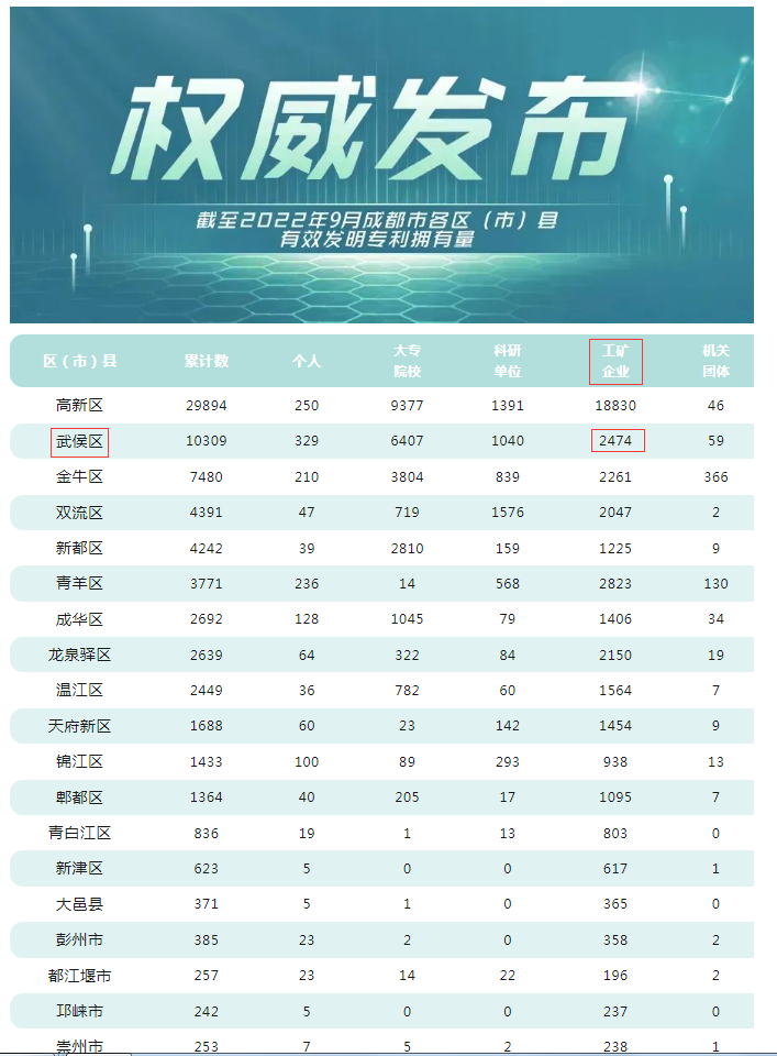 发明专利是知识产权领域最具含金量的证明。授权难度大,根据成都知识产权局2022年底发布的数据,武侯区工矿企业有效发明专利拥有量合计2474件。