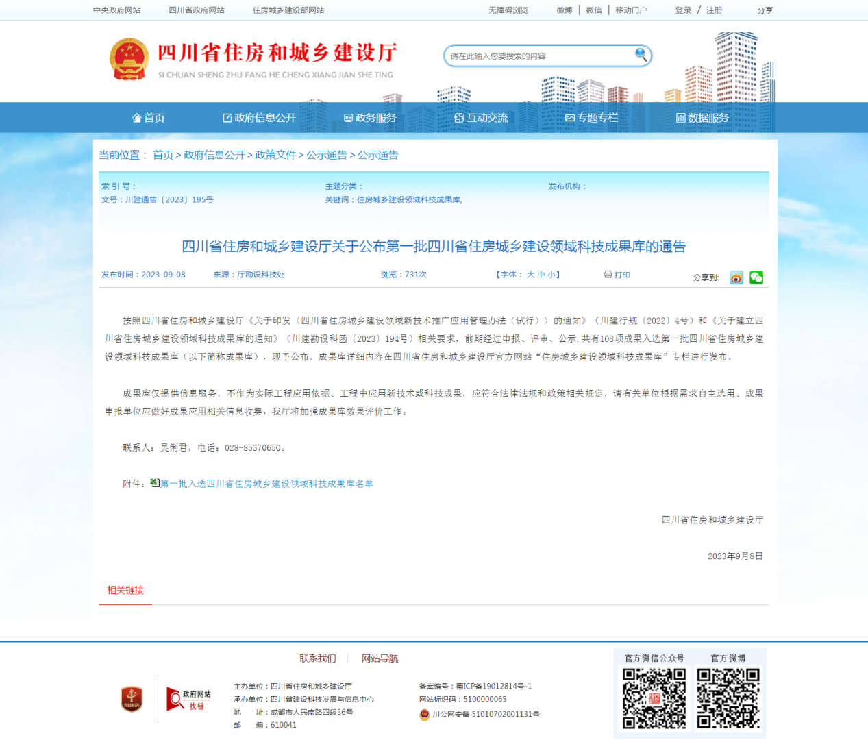 9月8日,四川省住房和城乡建设厅印发《关于公布第一批四川省住房城乡建设领域科技成果库的通知》,共有108项科研成果入选四川省住房城乡建设领域科技成果库。永沁环境一项应用技术成果成功入选,本次名单中仅有一项污水处理技术成果入选,仅有一家污水处理企业入选。