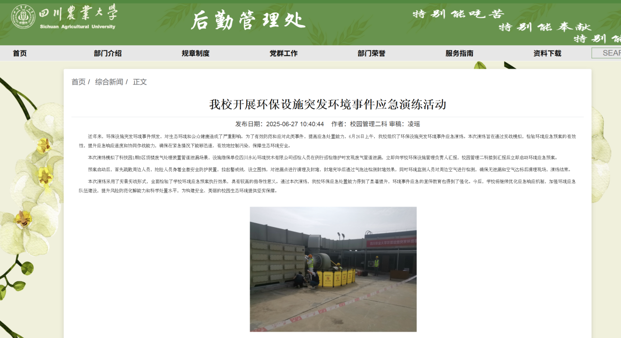 2025年6月26日,公司在四川农业大学科技园1期与学校共同进行了四川农业大学环保设施突发环境事件应急演练。本次演练模拟了科技园1期B区顶楼废气处理装置管道泄漏场景,设施维保单位永沁环境公司巡检人员在例行巡检维护时发现废气管道泄漏,立即向学校环保设施管理负责人汇报,校园管理二科接到汇报后立即启动环境应急预案。预案启动后,首先疏散周边人员,抢险人员身着全套安全防护装置,拉起警戒线、设立围挡,对泄漏点进行清理及封堵,封堵完毕后通过气泡法检测封堵效果,同时环境监测人员对周边空气进行检测,确保无泄漏和空气达标后清理现场,演练结束。
