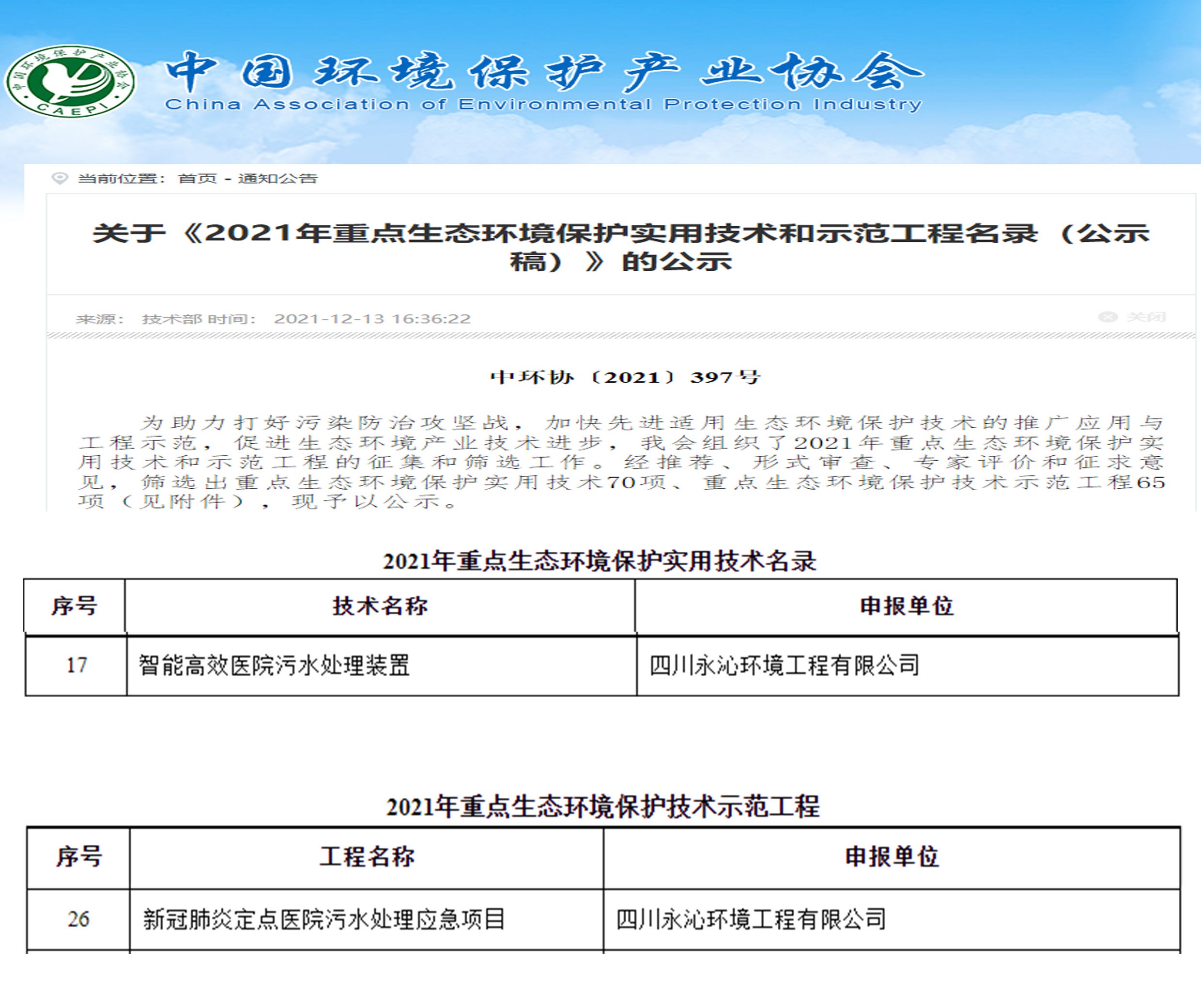 2021年度,我司2项技术装备入选该名单。智能高效医院污水处理装置入选重点生态环境保护实用技术,新冠肺炎定点医院污水处理应急项目入选重点生态环境保护技术示范工程。