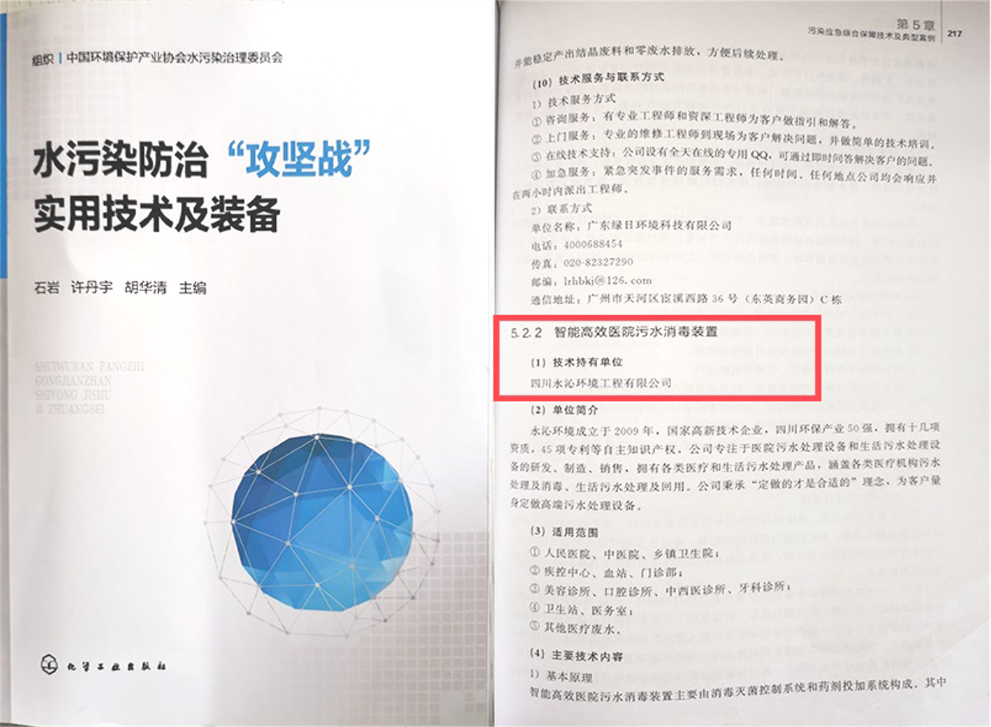 公司2项核心技术装备,分散式一体化污水处理设备、智能高效医院污水消毒装置载入《水污染防治“攻坚战”实用技术及装备》一书。