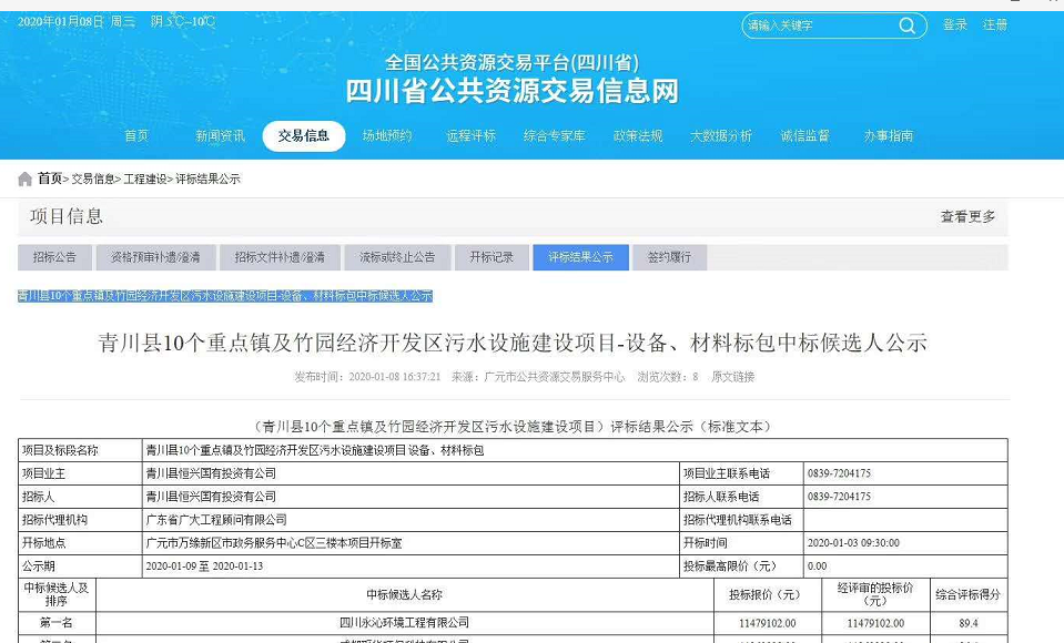 项目内容:青川县10个重点镇及竹园经济开发区污水设施建设,中标金额11479102元。项目采用一体化污水处理设备,出水达一级A标。