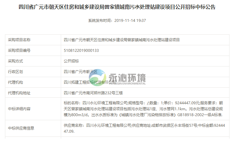 日前,我公司中标四川省广元市朝天区住房和城乡建设局曾家镇城南污水处理站建设项目。