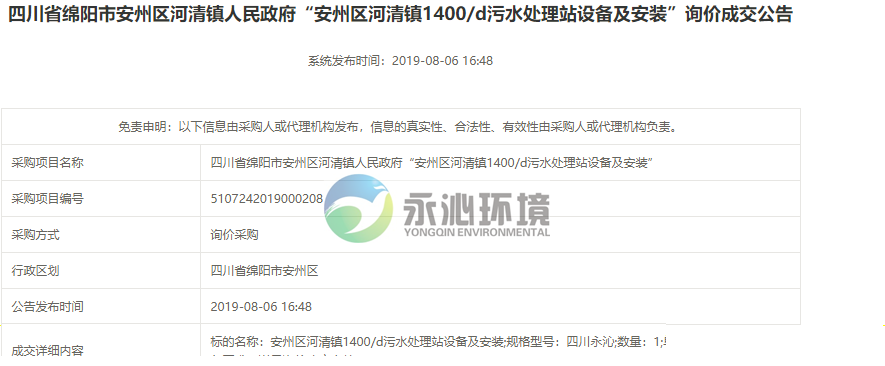 日前,我公司中标安州区河清镇人民政府“安州区河清镇1400方/天污水处理站设备及安装”项目。我公司依靠村镇污水处理领域的丰富业绩和强大的专利布局,成功中标。