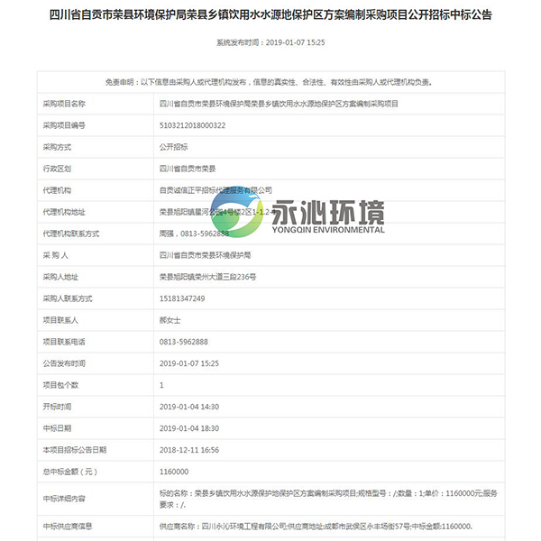 日前,我公司中标四川省自贡市荣县环境保护局荣县乡镇饮用水水源地保护区方案编制采购项目。公司凭借强有力的技术团队,提出了完美的方案设计理念,从而在众多竞争者中脱颖而出,顺利中标。 项目内容:荣县乡镇饮用水水源保护地保护区方案编制设计,中标金额为116万元。
