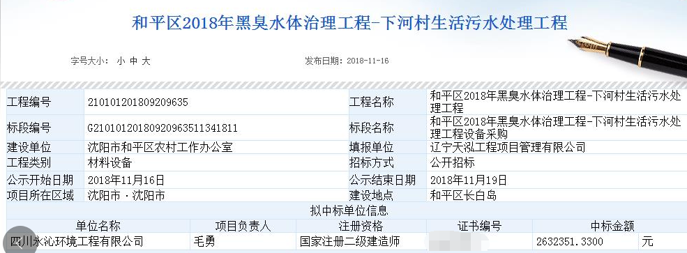 日前,我公司中标“沈阳市和平区2018年黑臭水体治理工程-下河村生活污水处理工程”。我公司在多家竞标单位角逐中脱颖而出,顺利中标。