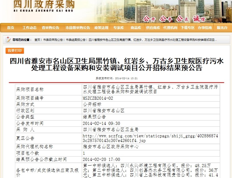 日前,公司中标四川省雅安市名山区卫生局黑竹镇、红岩乡、万古乡卫生院医疗污水处理工程设备采购和安装调试项目。在本项目中,公司凭借业绩、技术、服务优势,在综合评分中排名第一。