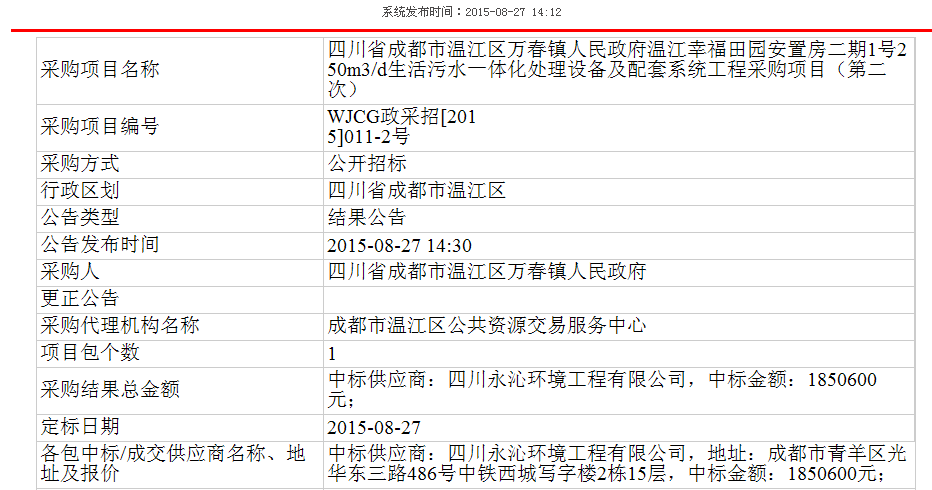 日前,公司中标四川省成都市温江区万春镇人民政府温江幸福田园安置房二期1号250m3/d生活污水一体化处理设备及配套系统工程采购项目,我方将为安置小区提供2套一体化污水处理设备,同时负责配套工程建设。