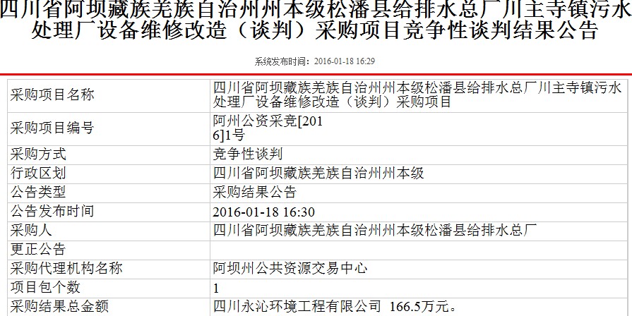 公司中标阿坝州松潘县给排水总厂川主寺镇污水处理厂设备维修改造(谈判)采购项目