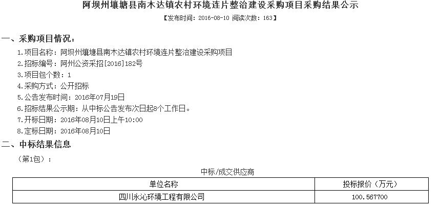 日前,我公司于2016年8月10日顺利中标—阿坝州壤塘县南木达镇农村环境连片整治建设采购项目,中标金额为100.567700万元。该项目日处理量为:5方/天(4套一体化污水处理设备),这是公司核心技术-分散式一体化污水处理设备在农村污水领域又一突破。