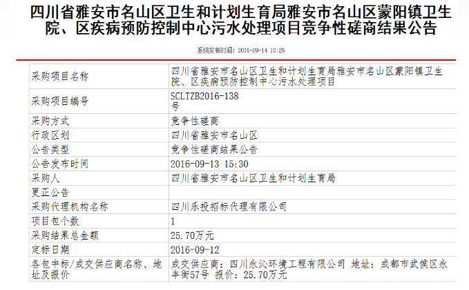 日前,我公司凭借丰富的实践经验成功中标——四川省雅安市名山区卫生和计划生育局雅安市名山区蒙阳镇卫生院、区疾病预防控制中心污水处理项目。中标金额:25.70万元,该工程内容为:2套一体化污水处理设备。该设备是我公司特色设备之一,并获多个国家专利殊荣,专利号:ZL 2011 0340380.5,ZL 2014 2 03292.4等。