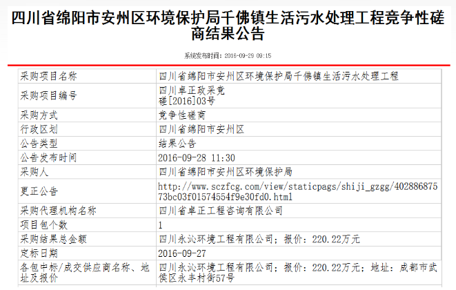 日前,我公司成功中标——四川省绵阳市安州区环境保护局千佛镇生活污水处理工程。中标金额:220.22万元,该工程内容为:生物转盘及其配套设施。该设备是我公司22项专利设备之一,专利号:ZL 2015 2 0037493.6。