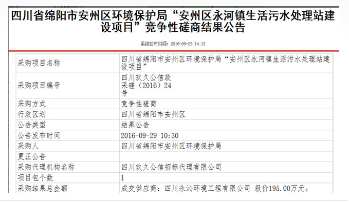 日前,我公司成功中标——四川省绵阳市安州区环境保护局“安州区永河镇生活污水处理站建设项目“。中标金额:195.00万元,该工程内容为:生物转盘。该设备是我公司22项国家专利设备之一的特色设备,在实际应用中效果极佳,得到广大业主的肯定,专利号为:ZL 2015 2 0037493.6。