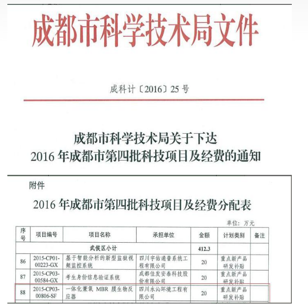 日前,公司产品:一体化兼氧MBR膜生物反应器入选2016年成都市第四批科技项目的重点新产品研发,并获得20万元的研发补贴。该项产品也荣获国家专利技术,专利号为:ZL 2014 2 0629743.0。