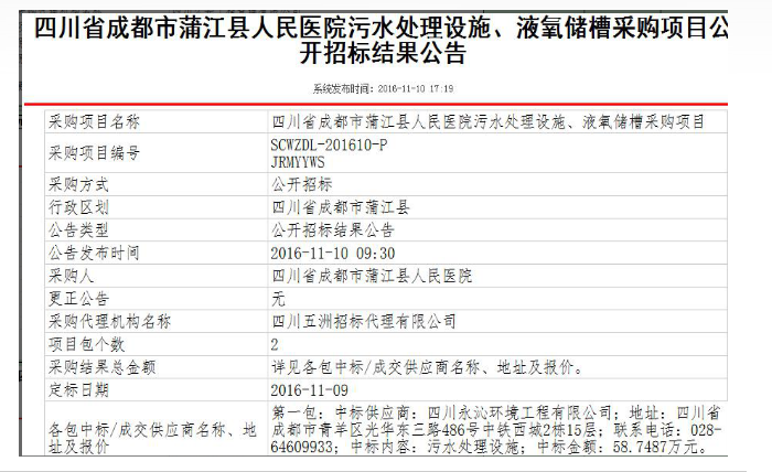 2016年11月10日,我公司成功中标——四川省成都市蒲江县人民医院污水处理设施、液氧储槽采购项目。中标内容为:该项目第一包——污水处理设施,该项目中标金额:58.7487万元。该项目中标是我公司在医院污水处理这一业务领域取得新的进展,同时也彰显我公司在医院污水处理中的技术实力。