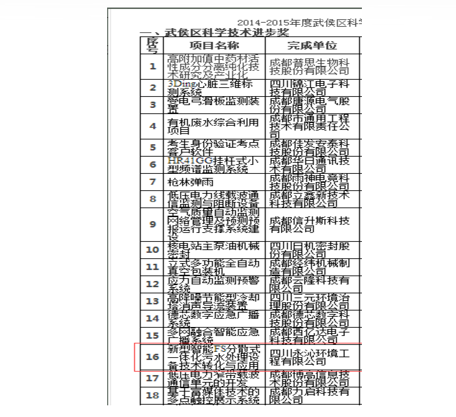 此奖项在武侯区众多公司中共有20家企业获得科学技术进步奖,我公司的新型智能FS分散式一体化污水处理设备技术转化与应用也是在众多候选名单中脱颖而出。该奖项是对我司能力以及技术的大力认可,今后,公司会在以后的项目中为业主提供更周到、专业的技术服务支持。