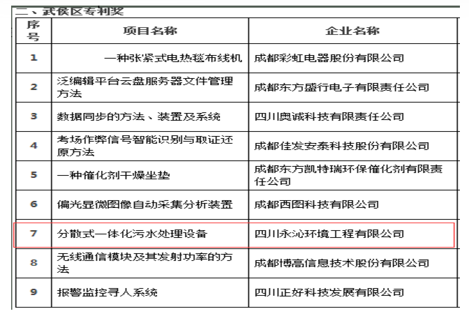 日前,公司喜获武侯区专利奖,获奖项目名称:分散式一体化污水处理设备。