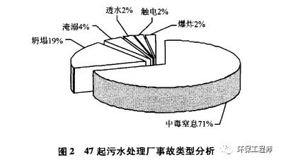 通过对我国污水处理厂事故发生的类型进行统计和分析可以看出的是污水处理厂事故的类型主要是:中毒窒息、坍塌、淹溺、爆炸、触电、透水等,而其中最主要发生的事故类型是中毒窒息事故,发生的概率是70%。就引起中毒事故发生的原因来看,硫化氢是引起中毒事故的主要原因,沼气是引起窒息事故的主要原因。而且中毒事故中容易对工作人员造成人员伤害的主要原因是个人的防护用品失去了效果或者并没有按照规定在作业期间使用防护用品。而且污水处理厂设备出现缺陷、错误的操作、设施没有达到规定的标准、通风不良等都是造成人员伤亡的原因,但是个人防护用品的使用是引起中毒窒息事故中人员伤亡的主要原因,发生率高达78%。