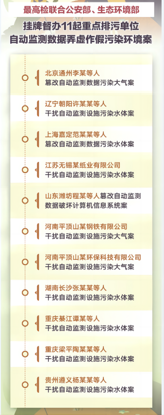 这11起案件分别为:北京通州李某等人篡改自动监测数据污染大气案、辽宁朝阳许某某等人干扰自动监测设施污染水体案、上海嘉定范某某等人篡改自动监测数据污染水体案、江苏无锡某纸业有限公司干扰自动监测设施污染水体案、山东潍坊程某等人篡改自动监测数据破坏计算机信息系统案、河南平顶山某钢铁有限公司干扰自动监测设施污染大气案、河南平顶山某环保科技有限公司干扰自动监测设施污染大气案、湖南长沙张某某等人干扰自动监测设施污染水体案、重庆綦江谭某等人干扰自动监测设施污染水体案、重庆梁平陶某某等人干扰自动监测设施污染水体案、贵州遵义杨某某等人干扰自动监测设施污染水体案。