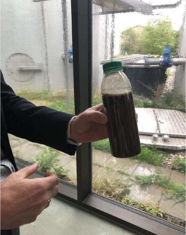 赫勒福医院的污水流入这里后,先经过预处理程序,筛掉大于直径大于1.5mm的杂质颗粒。这些深褐色的污水会流入处理池,缓冲器对污水流量进行平滑处理,再进行生物处理,使用间歇性充气处理掉污水中的氮,然后通过化学方式对污水中的磷进行沉淀。